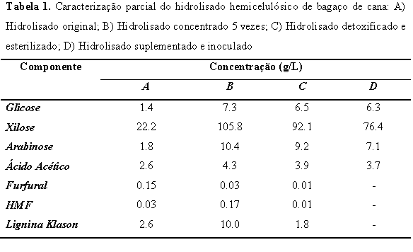 RESULTADOS E DISCUSSÃO: Conforme pode ser observado na Tabela 1, xilose, arabinose e glicose (em concentrações decrescentes) foram os principais açúcares detectados no hidrolisado original. Ácido acético, furfural, hidróxi-metil-furfural (HMF) e derivados da lignina (lignina Klason), subprodutos da hidrólise ácida que influenciam negativamente o metabolismo microbiano, também foram detectados neste hidrolisado. Enquanto os teores de açúcares aumentaram proporcionalmente ao fator de concentração do hidrolisado (5 vezes), as concentrações de compostos inibitórios comportaram-se de maneira distinta durante a concentração. Tanto a detoxificação quanto a suplementação nutricional promoveram alterações consideráveis na composição do hidrolisado, destacando-se uma forte redução no conteúdo de compostos inibitórios ao metabolismo microbiano e uma sensível diminuição no teor de xilose, respectivamente.