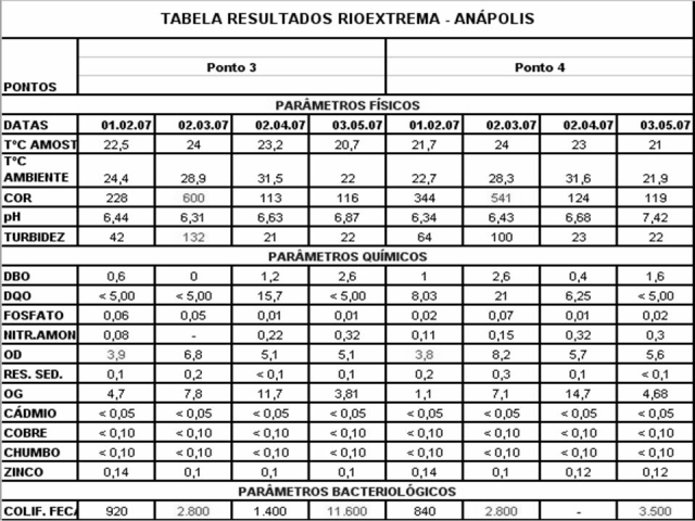 Este trabalho tem como objeto principal, monitorar durante quatro meses a água do Rio Extrema através de análises Físico-Químicas e Microbiológicas. Tais análises visam avaliar a qualidade da água bruta, proveniente dos trechos amostrados no Rio Extrema que pertence à bacia hidrográfica do Rio das Antas e se localiza no município de Anápolis-GO. O Rio Extrema nasce próximo ao Distrito Agroindustrial de Anápolis (DAIA) e se estende pelo terreno da Unidade Universitária de Ciências Exatas e Tecnológicas da UEG, sendo esse local o trecho de interesse do estudo. No rio com 22,852 Km de extensão foram amostrados 4 pontos escolhidos por critérios técnicos. Sendo o ponto 1 na sua nascente o ponto 2 e 3 no terreno da UEG, que é o local de interesse da pesquisa e o ponto 4 é a jusante do rio.