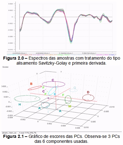 O registro dos espectros de reflectância difusa das amostras foi realizado utilizando um Espectrofotômetro NIR, da Bomem, modelo. A região espectral selecionada para o tratamento quimiométrico foi de 4.420 a 5.944 cm-1, sofrendo tratamento com alisamento Savitzky-Golay e primeira derivada, mostrada na figura 2.0.