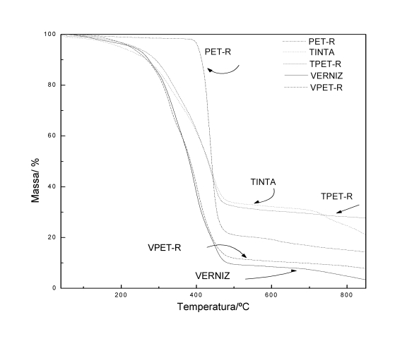 MATERIAL E MÉTODOS: Garrafas tipo PET foram coletadas, lavadas e cortadas em pedaços de aproximadamente 2mm2. As amostras de PET-R foram dissolvidas com fenol e tetraclorometano a quente, ~60°C. Após a dissolução, as amostras foram diluídas com triclorometano, para estabilização. Já as amostra de tinta e de verniz foram dissolvidas separadamente com triclorometano. Em seguida cada amostra de solução de PET-R foi adicionada gota a gota sobre a solução de tinta e de verniz, respectivamente, evaporado o excesso de solvente. Das misturas PET-R/tinta (TPET-R) e PET-R/verniz (VPET-R) foram obtidos filmes em placas de vidro os quais foram secos em temperatura ambiente. Após 48 horas, foram coletadas amostras para análise térmica.