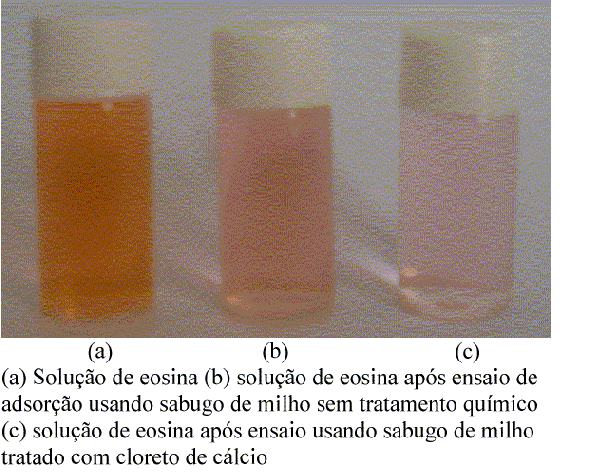 Foi realizado um teste colocando, sob agitação mecânica por 5 h, sabugo de milho triturado e solução 0,1 mol/L de cloreto de cálcio, na proporção de 0,5 g de sabugo para 25 mL de solução. Em seguida filtrou-se a vácuo e realizou-se um ensaio de adsorção usando este sabugo tratado com 25 mL de eosina nas concentrações 0,000012 mol/L; 0,000024 mol/L; 0,000036 mol/L; 0,000048 mol/L; 0,000060 mol/L; 0,000072 mol/L e tempo de agitação de 14 h.
