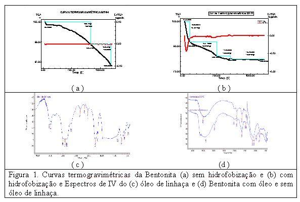 MATERIAL E MÉTODOS: A bentonita foi desagregada em almofariz de porcelana, peneirada até obter a granulometria de 250 mesh. A modificação do material foi gerada de forma bastante homogênea, solubilizando a linhaça e parafina em hexano e posteriormente a adição da argila sob evaporação. A sintetização da água produzida foi realizada através da solubilização de 10mL de óleo diesel comercial em 3L de uma solução salina (50g/L) sob agitação constante a 40ºC e posteriormente a separação do óleo insolúvel do solúvel com o uso de um funil de separação.A argila modificada foi empacotada em colunas de vidro de acordo com o planejamento fatorial 23 com dois níveis e três fatores (Tipo do Hidrofobizante, percentual de hidrofobizante e volume de solução oleosa) nos seus respectivos níveis inferiores (parafina, 1% e 40mL) e superiores (óleo de linhaça, 3%, 100mL), sendo realizados oito ensaios com repetições totalizando dezesseis ensaios. A água produzida sintetizada com alta salinidade foi posteriormente introduzida à coluna sem controle de fluxo, o líquido filtrado foi extraído com hexano e analisado por fluorescência. O pó resultante da granulometria foi caracterizado por termogravimetria TA Instruments modelo 2950, em fluxo de ar com taxa de aquecimento de 10ºC/min, como também por espectrofotometria na região do infravermelho.