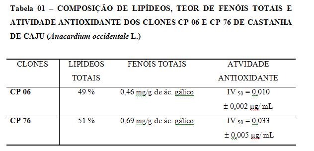 TÍTULO: COMPOSIÇÃO LIPÍDICA, TEOR DE FENÓIS E ATIVIDADE ANTIOXIDANTE DA CASTANHA DE CAJU (Anacardium occidentale L.) DOS CLONES CP 06 e 76.
