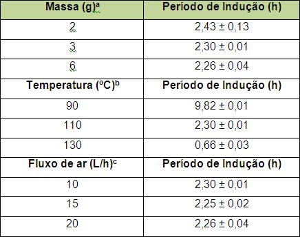 CONCLUSÕES: Foi visto que a quantidade de amostra e o fluxo de ar não têm qualquer influência perceptível na estabilidade de óleos e biodiesel, desde que o seu efeito sobre a temperatura seja compensado. O parâmetro de qualidade fundamental é, sem dúvida, a temperatura, uma vez que ela mostra um impacto significativo sobre o tempo de indução medido e, portanto, tem de ser ajustada e controlada com precisão durante a produção e/ou armazenamento das matérias-primas e dos biodiesel gerados.