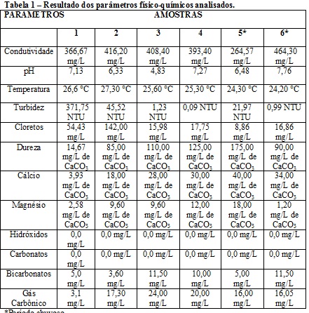 RESULTADOS E DISCUSSÃO: RESULTADOS E DISCUSSÃO: Na tabela 1 abaixo, estão relacionados os valores dos parâmetros físicos e químicos, analisados na água de barreiro usada no fabrico de queijo coalho artesanal, os períodos chuvoso e seco.Conforme a tabela 1, as medidas da condutividade registraram valores entre 364,57 a 416,20 mg/mL para o período seco, e entre 264,57 e 464,30 mg/mL para o período chuvoso. A condutividade elétrica está relacionada com a presença de íons dissolvidos na água, que são partículas carregadas eletricamente. Quanto maior for a quantidade de íons dissolvidos, maior será a condutividade elétrica da água que pode variar também de acordo com a temperatura e o pH (MOTA, 1995). As temperaturas da água medidas no local variaram de 24,20 a 24,30°C no período chuvoso, e 25,30 a 27,3°C no período seco. Essa elevação deve-se ao aumento de radiação no corpo d’água, observada no período seco. Tomando-se por base, os valores de pH encontrados para o período chuvoso (6,48 a 7,76) e seco (4,83 a 7,21), a amostra 3 apresenta abaixo do padrão e a demais nos padrões estabelecidos pela Resolução do CONAMA nº 357/05, a qual estabelece limites de 6,0 a 9,0. A influência do pH sobre os ecossistemas aquáticos naturais dá-se diretamente devido a seus efeitos sobre a fisiologia das diversas espécies (CETESB,1993). O valor da alcalinidade medidas em mg/L de CaCO3 - no período chuvoso está compreendido entre 34,0 a 40,0 e no período seco de 3,93 a 30,0. O valor de Cloreto medido no período chuvoso variou de 8,86 a 16,86 mg/L e no período seco 15,98 a 142,0 mg/L.Nas amostras do período chuvoso, os teores de dureza situaram-se na faixa de 90 a 175 mg/L (CaCO3) e no período seco 14,67 a 125.