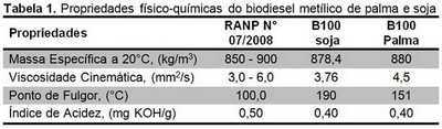 O trabalho teve como estudo principal, avaliar a mistura de biodiesel de palma e soja de acordo com as propriedades físico-químicas já mencionadas, comparando-as com as especificações da ANP.