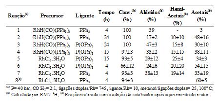 RESULTADOS E DISCUSSÃO: Os resultados da Tabela 1 mostram que o uso de solvente com o sistema da reação 1 favorece a reação de hidrogenação, o que não ocorre quando o mesmo sistema foi utilizado para a hidroformilação do OM na ausência de solvente (MENDES, 2007). Resultados satisfatórios são obtidos quando se utiliza um maior tempo reacional (reação 2). Quando PPh3 é substituída por P(OPh)3 (reações 3-4), obtêm-se uma maior quantidade de aldeído, mesmo após um longo período reacional. Nas reações 4-5, nota-se que o uso do precursor RhCl3.3H2O produz resultados semelhantes aos da utilização do RhH(CO)(PPh3)3, sob as mesmas condições. Com a diminuição do tempo reacional, com o sistema RhCl3.3H2O/P(OPh)3 (reação 6), observa-se uma diminuição na conversão e um aumento na seletividade em acetais. Com o uso de PPh3 (reação 7) observa-se uma melhora na conversão do sistema, mas uma queda na seletividade em acetais. Todas as reações foram realizadas em duplicata e nota-se a baixa reprodutibilidade dos resultados. Os tempos foram contados a partir do momento em que o reator atingiu 100ºC. Como os reagentes se encontram presente dentro do reator, a reação, mesmo que em menor velocidade, ocorre dentro do intervalo de tempo necessário para que o reator atinja 100°C. Sendo assim, apesar das reações terem permanecido por tempos fixos sob 100ºC, elas tiveram tempos totais diferentes, já que o tempo necessário para estabilização da temperatura do sistema varia entre 1 a 2 horas. Para contornar este problema, um funil de adição de aço adaptado ao reator, passou a ser utilizado para adicionar o precursor catalítico quando a temperatura do sistema se encontra estável a 100oC. Com esta nova condição (reação 8), os resultados foram mais reprodutíveis e todo o aldeído formado foi levado a acetal.