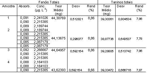Os valores da quantificação de fenóis totais (% equivalente ao ácido tânico) variam entre 44,13 a 44,64 mg, com desvios padrões bastante baixos variando entre 0,29 a 0,59. Segundo Monteiro e colaboradores (2005), os valores de fenóis totais presentes nas cascas da espécie em questão são de 46,44 mg (desvio padrão de 7,05). Os rendimentos percentuais, em relação ao material seco, estão compreendidos entre 8,66-8,86%. Esses dados descritos na Tabela 1 demonstram que os resultados estão em conformidade com a literatura. Em relação à quantificação dos taninos totais, os valores variam entre 38,28 a 39,33 mg, com desvios padrões variando entre 0,51 a 0,80, dentro dos limites aceitáveis. Esses dados estão de acordo com a literatura (MONTEIRO et al., 2005), que relata a presença de taninos, nas cascas dessa espécie, no valor de 40,93 mg (desvio padrão de 5,37). Enquanto, que os rendimentos percentuais estão na faixa de 7,78-7,87%.