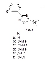 RESULTADOS E DISCUSSÃO: : A síntese dos 3-(aril)-5-(n-pentil)-1,2,4-oxadiazóis (3a-f), foi mediada por forno de microonda doméstico e consistiu em reagir as arilamidoximas 1a-f,separadamente, com pentanoato de metila e K2CO3, sem utilização de solvente (esquema 1). A metodologia empregada forneceu os produtos rapidamente, com duração de 8 minutos e bons rendimentos (80-85%).