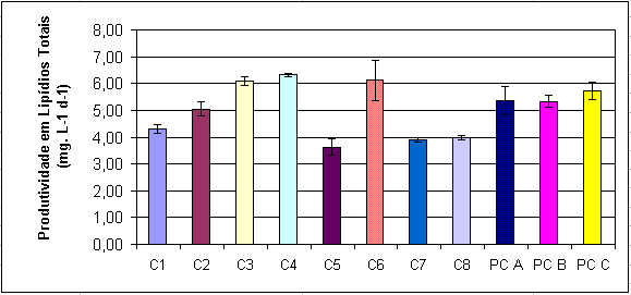 Produtividade em lipídios totais correspondentes aos ensaios (C1, C2, C3, C4, C5, C6, C7, C8, PC A, PC B e PC C) do planejamento experimental. As barras na vertical representam o erro padrão.