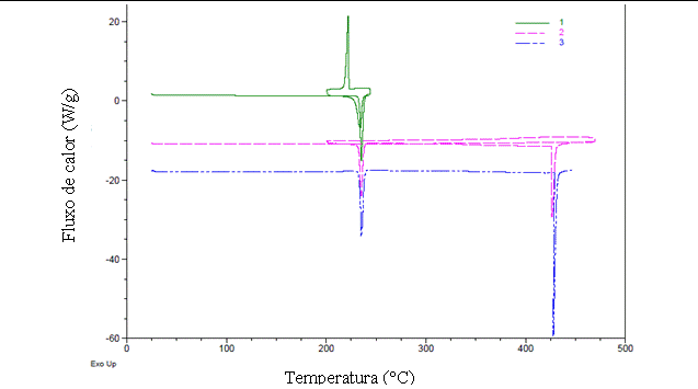 seguido de uma endotérmica em uma temperatura de 265 °C (Tonset = 243°C e o 3°