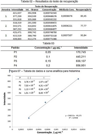 Tabelas 04, 05 e 06 apresentam os resultados obtidos para análise de histamina