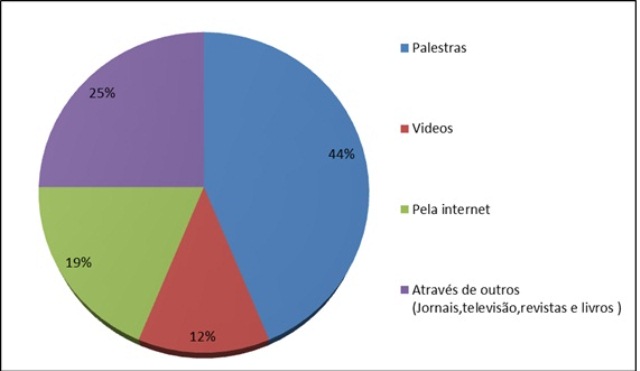 RESULTADOS E DISCUSSÃO: Os resultados obtidos mostram que os alunos encontram-se na faixa entre 20 a 32 anos, sendo que 87,5% residem em Confresa e 12,5% em outra cidade. Iniciou-se a pesquisa ressaltando que os problemas ambientais estão sendo discutidos constantemente na mídia e na sociedade, e o que os alunos entrevistados acham em relação ao assunto, onde 68,75% acham importantes, 18,78% ótimo e 12,5% não tem interesse. Nota-se no gráfico 1 os meios em que os alunos preferem discutir e assimilar os problemas ambientais, palestras(44%),outros meios de comunicação (25%),internet (19%) e vídeos (12%).