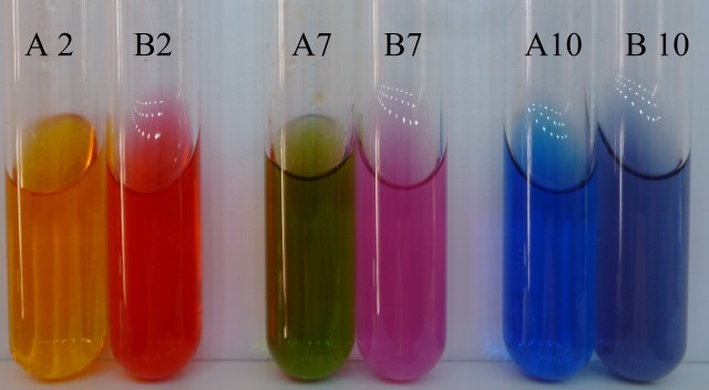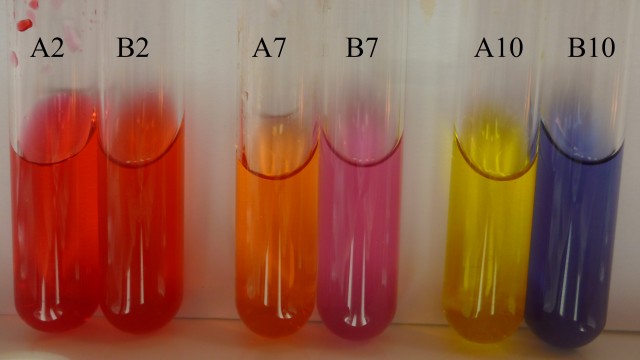 Tubos de ensaios em três níveis de pH (2, 7, 10).