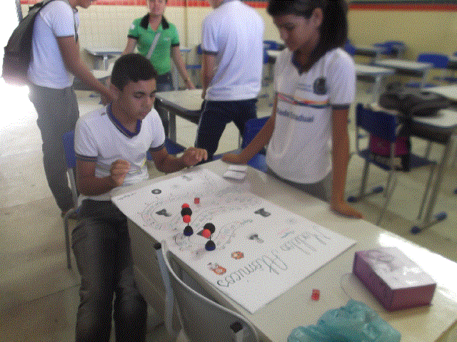 MATERIAL E MÉTODOS: O jogo didático foi planejado e executado pelos bolsistas com o auxílio dos professores do componente curricular de Química, nas turmas do 1º ano do Ensino Médio no 1º semestre do ano de 2013. O trabalho foi dividido nas seguintes etapas: iniciou-se com o planejamento do jogo a partir das aulas teóricas, que foram ministradas utilizando como recurso o livro didático; no segundo momento houve a construção do jogo didático com as regras que iriam nortear a brincadeira escritas e expostas ao lado do tabuleiro; em seguida foram elaboradas 25 (vinte cinco) questões e respostas, dispostas em cartões de cores diferentes (cartões azuis apresentavam perguntas e cartões vermelhos respostas relacionadas ao conteúdo de modelos atômicos). O tabuleiro foi numerado de 1 a 60, sendo estas as casa que marcam o início e final do jogo, e no decorrer do jogo havia 25 asteriscos que localizava as casas que continham as perguntas a ser respondida pelo jogador. O material utilizado foi de baixo custo e fácil, sendo eles: a cartolina, papelão, folhas A4, pinceis, tampinha de refrigerantes, bolinhas pequenas, de isopor, pinceis, dados, figuras ilustrativas para decorar o tabuleiro atômico.