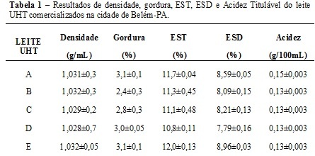 O leite é um alimento muito rico nutricionalmente, composto por água, sólidos totais, proteínas totais, gordura, lactose, minerais, além de vitaminas. Por ser altamente nutritivo, o leite pode se tornar um excelente meio de cultura para microrganismos deteriorantes e patogênicos. O leite de consumo deve obrigatoriamente passar por um tratamento térmico, para eliminar as bactérias patogênicas sem haver perdas significativas no potencial nutricional (MUJICA 2009). O tratamento térmico do leite pelo processo UHT (Ultra High Temperature) tem como objetivo a obtenção de um produto bacteriologicamente estéril e com as características nutritivas e sensórias do produto in natura (TRONCO, 2003). Entende-se por leite UHT, o leite homogeneizado que foi submetido a uma temperatura entre 130 e 150 ºC, durante 2 ou 4 segundos, imediatamente resfriado a uma temperatura inferior a 32 ºC e envasado sob condições assépticas em embalagens estéreis e hermeticamente fechadas (BRASIL, 2002). A avaliação físico-química do leite visa determinar o valor alimentar ou rendimento industrial e ainda detectar possíveis. É realizada através da análise de alguns parâmetros como, por exemplo, a acidez titulável, densidade, teor de gordura e de extrato seco total. No Brasil, mais de 90% do consumo de leite fluído se faz na forma de leite UHT e algumas pesquisas indicam problemas na qualidade físico-química deste produto. Considerando o consumo elevado desse produto e alguns problemas na obtenção da matéria prima, o objetivo deste trabalho foi avaliar a qualidade físico-química do leite UHT comercializado na cidade de Belém, Pará.