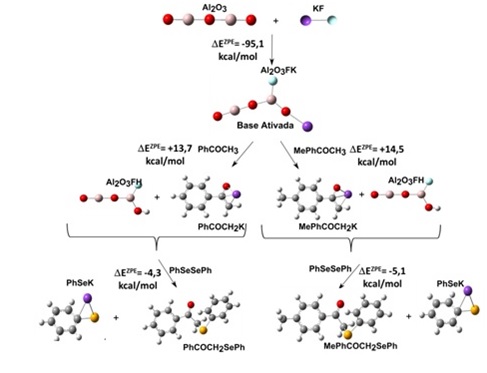 Neste trabalho propomos o mecanismo termodinâmico teórico da síntese dos compostos RCOCH2SeC6H5, R= -C6H5 e R= -C6H4Me a partir da reação envolvendo RCOCH3, PhSeSePh e a base Al2O3/KF. Os dados termodinâmicos foram obtidos com o nível de cálculo B3LYP/6-31++G(d,p) utilizando o programa de química quântica GAUSSIAN 2009. Nossos resultados mostraram que as etapas de ativação da base e formação dos produtos de interesse são termodinamicamente favoráveis.