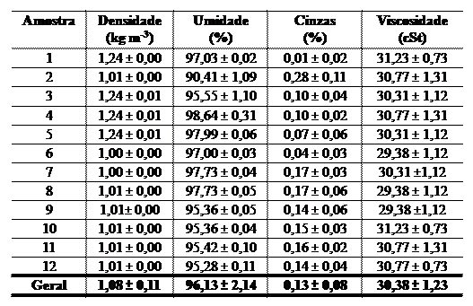produto pouco viscoso. As cinzas encontradas tiveram um valor médio de 0,13%,