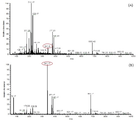 Espectros de massas referentes ao caldo de cana-de- açúcar submetido à dose de 5.000 ppm de peróxido de hidrogênio a 35%: (A) 0 min e (B) 90 min.