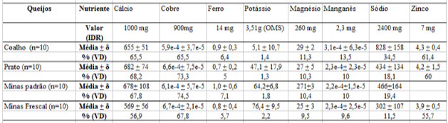 Os queijos se constituem uma fonte de vários minerais, que variam com procedimentos de fabricação, condições ambientais, bem como a eventual contaminação. Em relação aos valores declarados de sódio nos rótulos deve-se destacar que a legislação brasileira, permite uma variação de + 20%, logo os valores encontrados estavam na faixa aceitável. Porém, por questão de saúde pública relacionada às doenças crônicas devido ao consumo excessivo de sódio, faz-se necessário o desenvolvimento de produtos industrializados com menor teor de sódio, sem que percam suas características físicas e sensoriais.