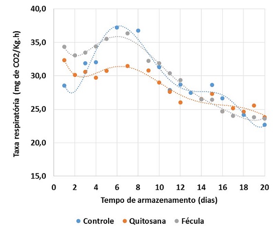 A cobertura de fécula de mandioca a 2% não foi capaz de reduzir a respiração e retardar o amadurecimento dos tomates armazenados em condições ambientes. A cobertura com quitosana a 2% reduziu a taxa respiratória dos tomates em 15,3% em comparação com o controle e prolongou em nove dias o início da senescência dos frutos.