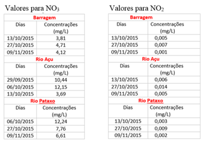 Nas amostras de nitrato da Barragem Armando Ribeiro Gonçalves, seus valores variaram de 3,81 à 4,71 mg/L revelando estar dentro dos limites estabelecidos. No Rio Piranhas-Açu na data 06/10/2015 a amostra mostrou uma alteração, atingindo 12,15 mg/L. No Rio Pataxo, um valor similar foi encontrado, 12,24 mg/L no dia 06/10/2015, contudo ainda estão dentro dos limites estabelecidos pela legislação. Nas análises de nitrito, os valores apresentaram todos abaixo de 0,014 mg/L, portanto dentro dos padrões permitidos de consumo.