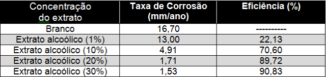 Tabela 1 – Valores de taxa de corrosão e eficiência obtidas com uso do extrato alcoólico.