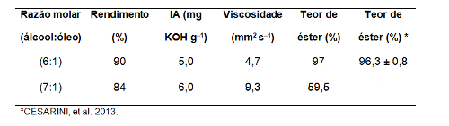 de (6:1) apresentou um teor de éster de 97%, acima do que a especificação da