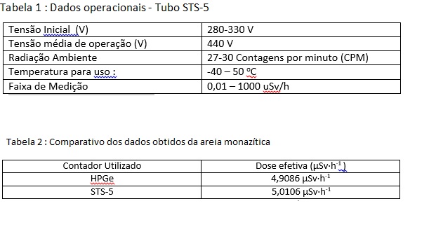 Tabela 1 : Dados operacionais - Tubo STS-5. Tabela 2 : Comparativo dos dados obtidos da areia monazítica.