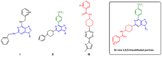 2,6,9-trisubstituted purine derivatives exhibited cytotoxicity and selectivity in several cancer cell lines. Therefore we designed and synthesized 34 new 2,6,9-trisubstituted purines, through a simple strategy of convergent synthesis in five step, with good yields. These compounds are being studied their cytotoxicity in cancer cell lines with the goal to develop new antitumor agents.