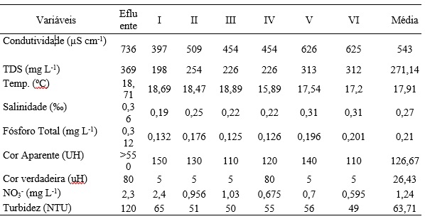 O trabalho da coleta foi realizado na cidade de Belém, no trecho do rio Maguari que banha parte da Orla de Icoaraci. Para análise, foram coletadas 7 amostras de água em recipientes estéreis de 1 litro, sendo o ponto de referência a amostra retirada diretamente do efluente liberado no rio, no ponto -1,2972, -48,4901. As demais foram coletadas a 1 metro de profundidade, sendo I e II na direção de saída do efluente, III e IV a 200 e 250 m respectivamente, ao norte, e V eVI a 200 e 250 m ao sul, sendo conservadas em gelo durante o transporte até o Laboratório de Química Analítica e Ambiental da Universidade Federal do Pará. Os materiais colhidos foram submetidos à análise de condutividade, TDS, temperatura e salinidade com auxílio do Oxímetro HANNA HI98280, para cor aparente e real – após a filtração a vácuo – com o Fotômetro HANNA HI4113, turbidez seguindo as normas da ABNT NBR, e para determinação do fósforo total foi utilizado um colorímetro de fosfato.