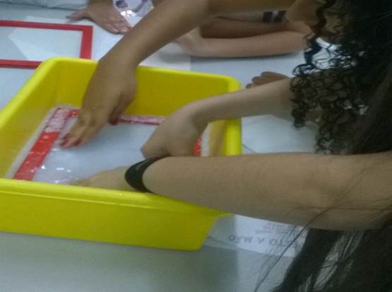 Alunos do 7º ano do Ensino Fundamental da EEEFM Professora Hosana Salles - ES, produzindo papel reciclável.