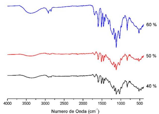Análise de FTIR das ligninas extraídas para 40%, 50% e 60% de etanol