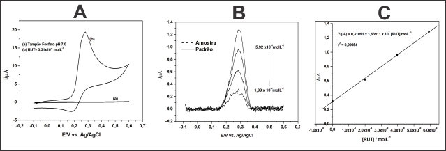 (A) Estudo de oxidação; (B) Voltamogramas de varredura linear em EPC para determinação de RUT da amostra; (C) Curva analítica extraída da Figura 1B.