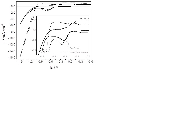 Os eletrodepósitos de Fe foram obtidos a partir de um banho contendo sais de ferro e do complexante para os íons metálicos. A célula eletroquímica utilizada foi do tipo Metrohm para três eletrodos com platina como eletrodo de trabalho, contra-eletrodo (fio de platina) e o eletrodo de referência (Ag/AgCl sat.). O potencial hidrogeniônico das soluções foi aferido com um pH-metro micronal B 474, utilizando eletrodo de vidro combinado. Os estudos potenciodinâmicos e potenciostáticos foram feitos com um potenciostato/galvanostato Autolab PGSTAT 128N. A análise morfológica dos eletrodepósitos foi realizada por microscopia eletrônica de varredura (MEV) e a composição química dos mesmos foi determinada por espectroscopia de dispersão de energia de raios X (EDX).
