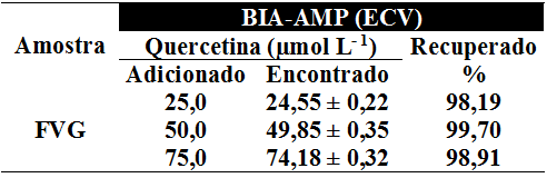 Valores de adição-recuperação de quercetina pelo sistema BIA-AMP com extrato de folhas da planta V. Guianesis.