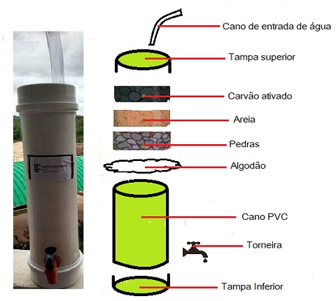 Imagem do Filtro artesanal e seu respectivo esquema de construção com seus constituintes.