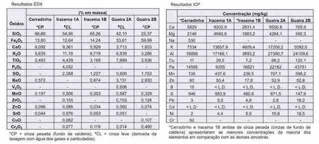 As cinzas das usinas Cerradinho e Iracema 1B apresentaram os maiores teores de SiO2 entre as cinzas de
