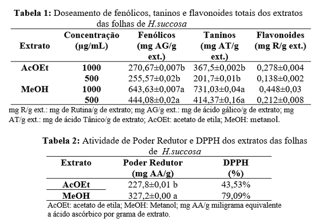 Todas as análises foram realizadas no laboratório de Bromatologia do IFPE – Campus Barreiros. A espécie vegetal H. succosa.foi coletada, identificada e depositada no herbário do Instituto do Meio Ambiente de Alagoas (IMA-AL). Suas folhas foram secas em estufa por 4 dias, moídas em moinho de facas e extraídas por maceração exaustiva por um periodo de 7 dias utilizando os solventes acetato de etila (AcOEt), metanol (MeOH) e hexano (Hex). Todas as análises foram realizadas em triplicata. No doseamento de fenólicos foi seguida a metologia proposta por Silva et al. (2006), onde o teor de fenóis foi expresso em miligramas equivalentes de Ácido gálico por grama de extrato (AG/g ext). O doseamento de taninos totais foi realizado segundo Shad et al. (2012), onde o teor de taninos totais foi expresso em miligramas equivalentes de ácido tânico por grama de amostra (mg AT/g ext.). Na análise de doseamento de flavonoides totais foi seguido a metodologia de Barroso et al. (2011), onde o teor de flavonoides foi expresso como miligramas equivalente de rutina por grama de amostra (mg R/g ext.). A avaliação da atividade sequestradora do radical (DPPH) foi realizada segundo Cavin et al. (1998). O ensaio para avaliação da atividade antioxidante mediante a determinação do poder redutor foi baseado no método proposto por Waterman e Mole (1994). Os resultados dos doseamentos de fenólicos e flavonoides dos extratos da espécie avaliada foram avaliados por comparação de médias, pelo teste de Scott-Knott a 5% de probabilidade, utilizando o programa estatístico SISVAR proposto por Ferreira (2011).