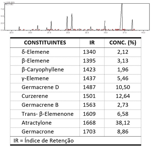 (38,12%), Curzerene (12,64%) e GermacreneD (10,5%), suas estruturas e seus
