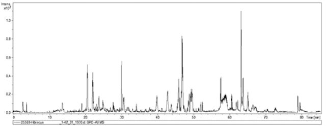 O cromatograma de íons totais do extrato de Hibiscus sabdariffa L. (Figura