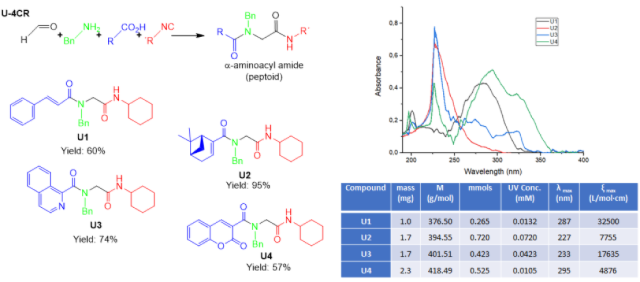 Multicomponent reactions (MCR) with isocyanides have become a fundamental tool in developing libraries of compounds with potential uses in pharmaceutical and biomedical studies. By P–3CR, 4 depsipeptides were synthesized, (P1–P4 Fig. 1), reaching between 15 and 40% yields. The low yield values are associated with the poor solubility of the reagents, it should be noted that even so they are comparable with the yields reported, and in agreement with the proposed mechanism of this reaction (REZA et al., 2012; WAHBY et al. 2022). By NMR, the products showed the signals corresponding to the formation of the new bonds. The δ of carbon from the ester function formed at values between 164 and 167 ppm, the amide carbonyls included in the same region, and the unshielded carbon (~63 ppm) and the singlet signals of the methylene protons between carbonyls groups (~4.5 ppm). The spectrophotometric determination demonstrated the strong absorption that all the compounds show in the UV region between 200 and 350 nm (Fig. 1). A total of 4 peptoids were synthesized through the U–4CR (U1–U4), in order to generate the desired electronic delocalization and maintain photophysical properties. The yields achieved above 55% may be due to the improved solubility of the starting acids, and formation of the iminium ion, a more reactive intermediate. The NMR and the other technics allowed for assigning the desired products. Two peptoids showed strong absorption bands at longer wavelengths U2 (287 nm) and U4 (295 nm) with a high-intensity band between 250 and 350 nm (Fig. 2), and showed a negative solvatochromic effect, results comparable with the UV spectrum of avobenzone and its behavior in different solvents (MTURI et al. 2008). In addition, U4 proved to be stable to UV exposure.
