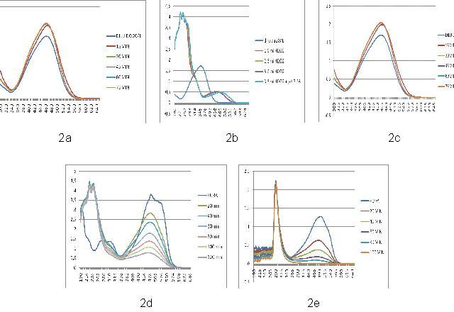 As variações no espectro de absorção do alaranjado de metila são mais acentuadas quando a solução é exposta à irradiação de lâmpadas de vapor de mercúrio combinado com o peróxido de hidrogênio a uma concentração de 2% e mantendo-se o pH abaixo de 4 (FIGURA 2d). Com cerca de 120 minutos de irradiação, a absorbância do corante caiu para menos de 1/3 da absorbância inicial. O rompimento total das ligações azo dar-se-ia com cerca de 180 minutos, momento em que a solução não apresenta mais nenhuma coloração.
