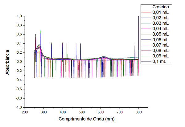 soluções de quitosana e caseína, todas à 655 nm. Os espectros foram utilizados