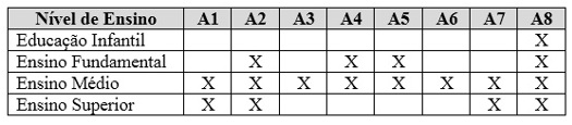 Este estudo se deu em um curso de licenciatura em Química do estado de Santa Catarina, fundado em 2010. Segundo os dados oficiais do curso, o licenciado em química deve ter formação sólida e abrangente em conteúdos dos diversos campos da Química e uma visão interdisciplinar capaz de contextualizar os saberes e integrá-los em seus conjuntos. Deve estar capacitado para a aplicação pedagógica do conhecimento de Química e de áreas afins na atuação profissional como educador na educação média e superior, bem como na indústria química e em laboratórios de pesquisa. Por ser um curso iniciado recentemente pareceu-nos importante confrontar a concepção dos licenciandos com os anseios do curso, especialmente quanto ao perfil profissional. Nesta perspectiva, durante dois semestres, na disciplina de Estágio Curricular Supervisionado II, explorou-se a discussão sobre a construção da identidade docente. Cada licenciando escreveu um texto que contemplasse a sua concepção sobre “ser professor”, as experiências e/ou pessoas que influenciaram nessa concepção durante a trajetória escolar. Foram investigados 8 textos dos licenciandos, utilizando da análise de conteúdo, proposta por Bardin (2010), a partir da: a) organização do material de trabalho em uma tabela, identificando os alunos pela sigla A, seguido por um índice numérico de 1 a 8; b) Definição de unidades de registro ou significado a partir de uma leitura flutuante do material buscando palavras ou locuções que contribuíssem com a investigação conforme os níveis de ensino que se pretendia investigar - Educação infantil, Ensino fundamental, Ensino médio, e Ensino superior; c) Delimitação do tema, sintetizando o conteúdo analisado; d) Categorização; e e) Inferências sobre os dados, analisando-os conforme frequência e significado.