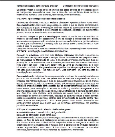 Considerando as atuais exigências do ensino de Química e o cenário dos pressupostos Ciência, Tecnologia, Sociedade e Ambiente - CTSA, bem como as lacunas existentes no desenvolvimento de práticas educacionais que tenham como foco o contexto local, temos como objetivo apresentar a estrutura de uma sequência didática como material possivelmente capaz de auxiliar o ensino-aprendizado na perspectiva CTSA com foco na temática central Manguezal, ecossistema local da capital de São Luís-MA. A sequência didática busca, de acordo com a investigação das problemáticas inerente aos Manguezais, à contextualização dos assuntos químicos sob a perspectiva das relações CTSA com ênfase na Teoria Cinética dos Gases, conteúdo integrante do currículo programático para a série do 2º ano do ensino médio.
